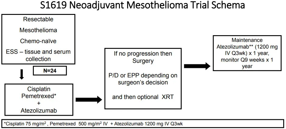 S1619研究旨在评估化疗加PD-L1免疫新辅助治疗、手术切除和辅助放疗后进行维持免疫治疗是否会增强T细胞的活化作用,并改善恶性胸膜间皮瘤患者的总生存期 (OS)。三联疗法的剂量如下:75 mg/m2顺铂、500 mg/m2培美曲塞和1200 mg IV Q3w阿替利珠单抗。只要患者没有出现疾病进展,则继续进行手术,术后接受为期1年的阿替利珠单抗维持治疗。
