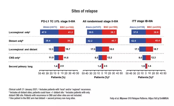 Impower010试验中,阿替利珠单抗和最佳支持治疗组之间的复发部位没有明显差异(LBA9, ESMO 2021)