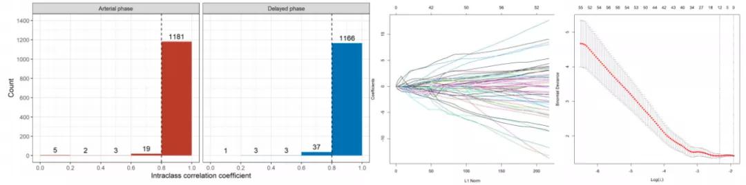 研究连续纳入2018年9月-2021年2月间,复旦大学附属中山医院使用仑伐替尼+PD-1抑制剂一线治疗,且至少接受过一次影像学评价应答的患者,其中肝内肿瘤应答每2个月(±2周)使用改良版RECIST标准评价一次,肝内最佳应答评价为完全缓解(CR)或部分缓解(PR)的患者被定义为影像学缓解患者,而病情稳定(SD)或疾病进展(PD)患者属不缓解患者。研究从基线磁共振增强的动脉期和延迟期提取影像组学特征(radiomics features),并使用LASSO模型进行特征选择,以神经网络构建预测模型,以受试者工作特征(ROC)曲线中约登指数最大化确定最佳的截断值(Cut-off Value)。