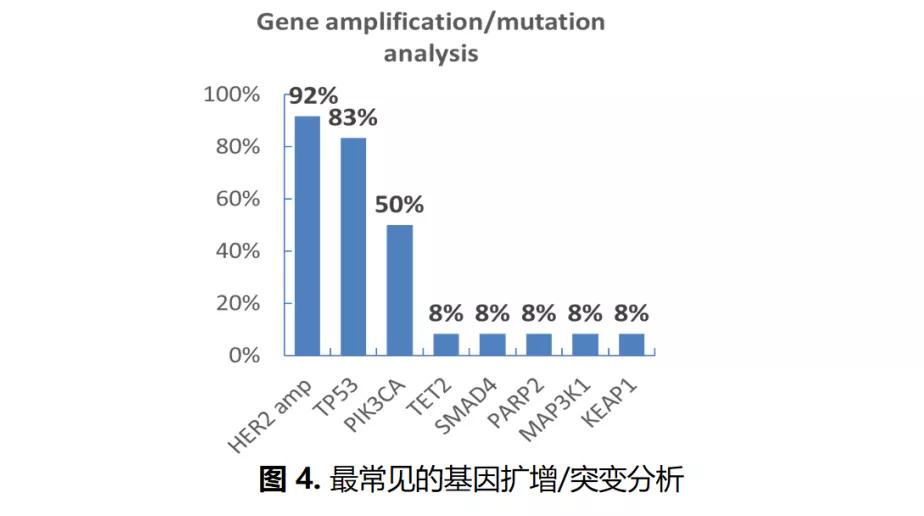 在12例具有全面基因组变异分析数据的患者中,11例(92%)患者存在Her2 扩增,10例(83%)存在TP53突变,6例(50%)存在PIK3CA突变(如图4所示,根据突变频率显示前8名常见扩增/突变基因)。