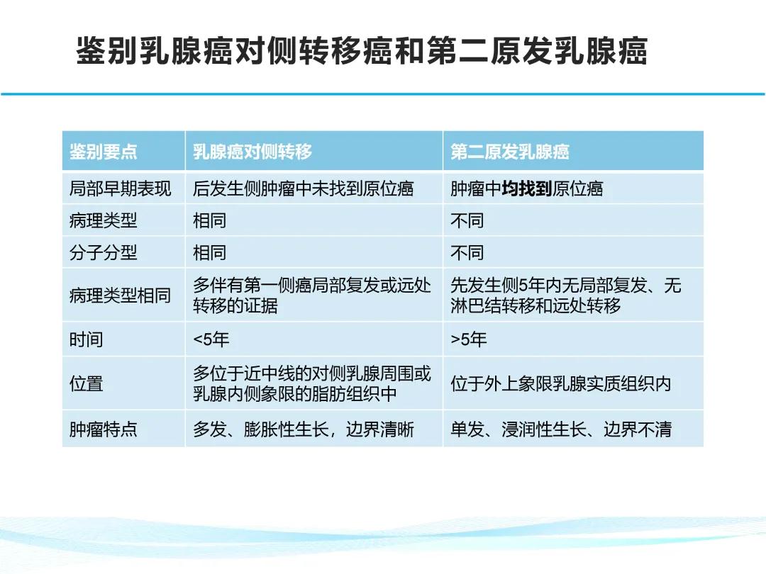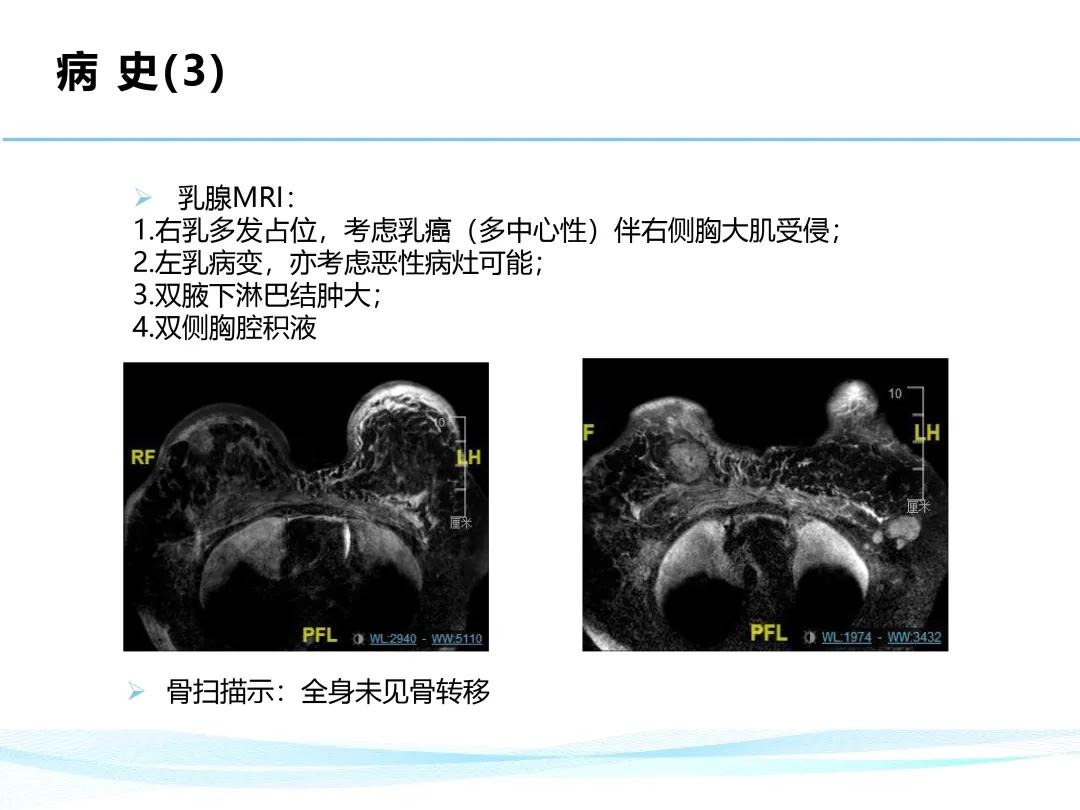 患者就诊时发现双侧乳腺癌,需要鉴别是双侧原发乳腺癌,或是一侧为原发而另一侧为转移癌,可以通过是否有原位癌成分、病理类型、分子分型、有无远处转移等加以鉴别,尤其对于无远处转移的患者明确双侧原发乳腺癌对局部治疗策略的考虑至关重要。该患者当时的病理未提及原位癌信息,术后病理显示相同的病理类型及分子分型,尤其在就诊时已为晚期乳腺癌,因此考虑一侧为原发乳癌,另一侧转移癌可能性更大。患者已出现双侧乳房皮肤病变、远处多发淋巴结肿大、双侧胸腔积液,手术等局部治疗无法改善患者生存,不作为常规治疗方法。但对于乳房局部有破溃的患者,姑息性的乳腺局部切除或可在一定程度上改善患者的生活质量,加之患者强烈要求,手术治疗也不失为一种可以考虑的治疗。