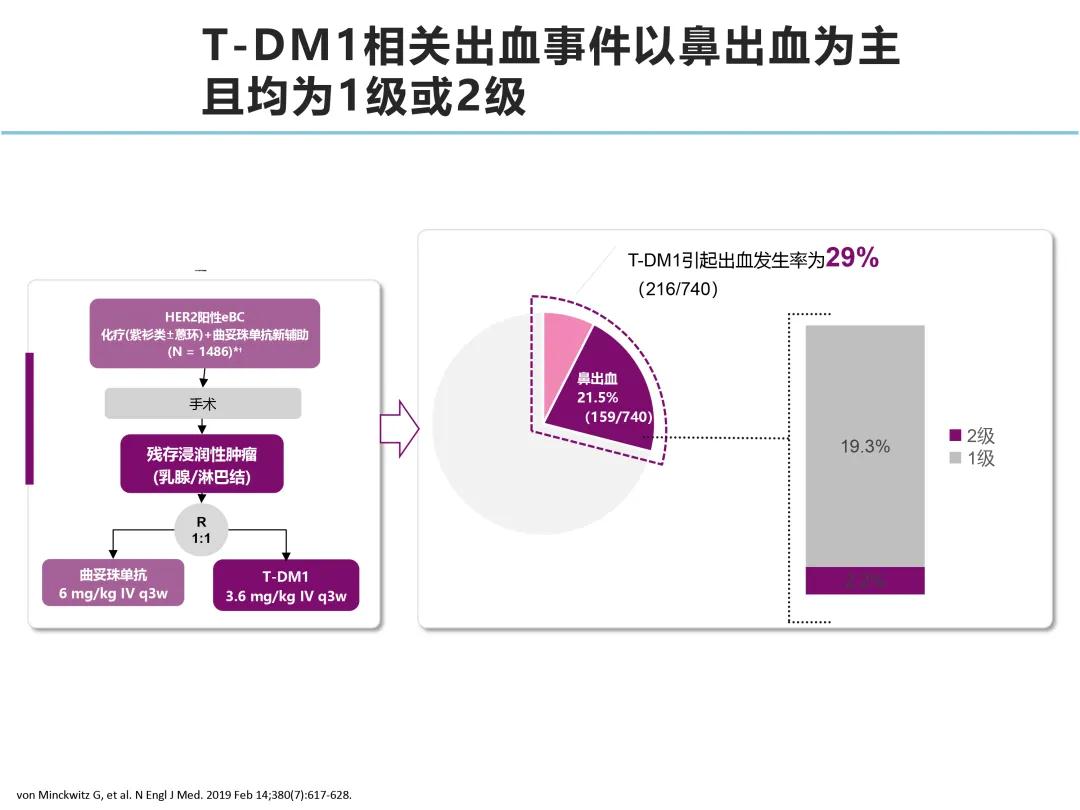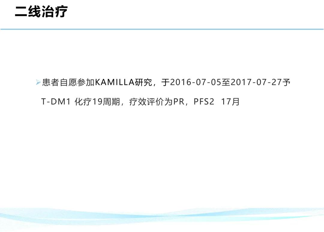 编者按:本文报告了一例初诊IV期的HER2+乳腺癌患者,患者在曲妥珠单抗+化疗(当时曲帕双靶方案尚不可及)一线治疗的情况下,获得了长达26个月的PFS1;二线治疗时入组KAMILLA研究,使用T-DM1治疗,则获得了长达17个月的PFS2;但患者由于发生轻度鼻出血症状后主动退出研究,3个月后即发生疾病进展。该病例提示抗HER2一线治疗对长期控制疾病有积极意义;而当前标准二线治疗方案T-DM1仍可为患者带来延长生存的希望。