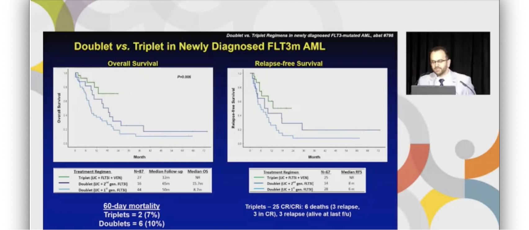 目前,国际上针对FIT3突变的不适合化疗或者老年AML患者的标准治疗方案是采用去甲基化药物联合FIT3抑制剂的两药联合方案治疗。Venetoclax是一种新的BCl-2抑制剂,对于FIT3基因突变或者其他的一些基因异常,甚至p53基因突变也有不错的疗效。第一项研究针对去甲基化药物联合Venetoclax及FIT3抑制剂组成的三药联合方案和标准方案的比较,主要应用的人群是老年和不适合化疗的 AML患者,且伴有FIT3突变的患者人群(大会摘要号:798)。