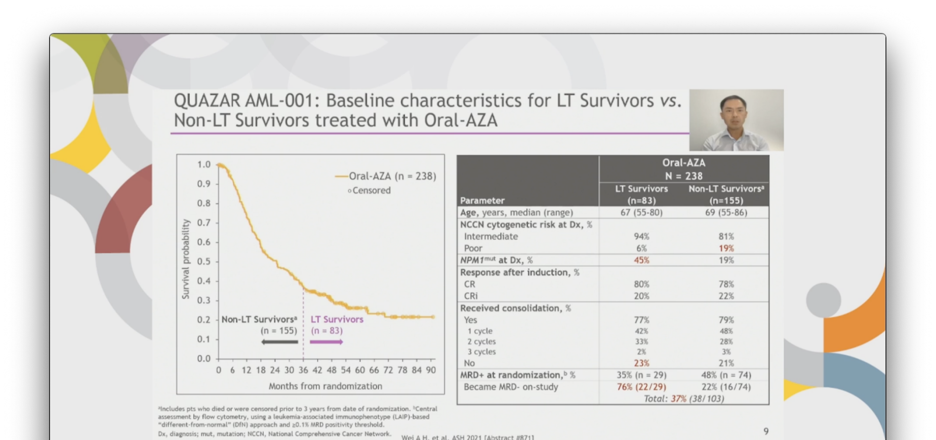 中位随访时间51.7个月,治疗组较对照组在OS上的优势仍然显著(24.7 vs. 14.8个月,P=0.0008);Kaplan-Meier估计的3年OS率分别为37.4% vs. 27.9%,显示更加明确的分离趋势而并非如48个月时曲线显示有融合趋势。在获得长期生存(≥3年)者队列中,治疗组83例,对照组57例。进一步分析表明,中危细胞遗传学、NPM1突变以及MRD转阴率与QUAZAR AML-001的长期生存率相关。