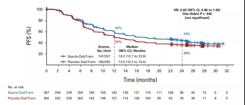 sparta-DabTram组和安慰剂-DabTram组的中位PFS分别为16.2个月和12.0个月(HR 0.82,95%CI:0.66~1.03 ;单侧P= 0.042 ,未达显着性)。两组患者的24个月PFS率分别为为44%和36%。