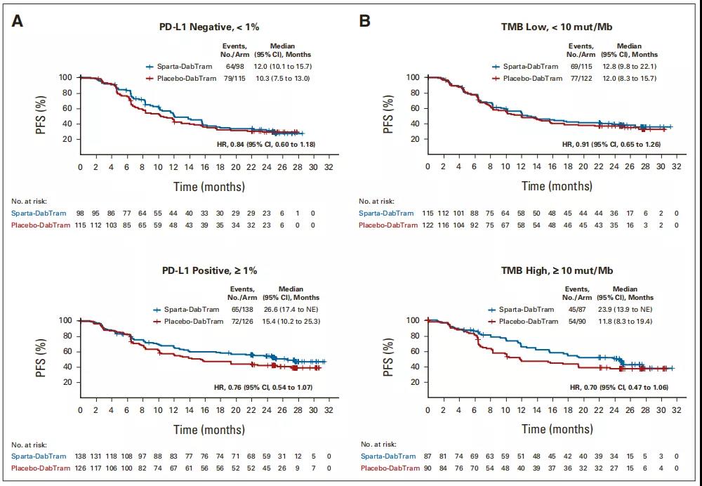 PD-L1状态似乎在两个治疗组中都具有预后意义,相较于PD-L1阴性(<1%)患者(HR 84),PD-L1阳性(≥1%)患者(0.76)的PFS获益趋势更明显;TMB-H(HR 0.70)和TMB-L(HR 0.91)也是如此。但这4种亚组患者中sparta-DabTram相较于安慰剂-DabTram均无PFS显着获益。