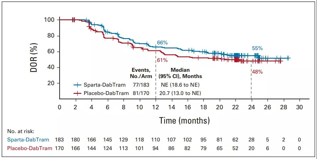 sparta-DabTram组和安慰剂-DabTram组的ORR分别为69%(183/267)和64%(170/265),CR率分别为20%(53/267)和18%(47/265),中位DOR分别为未到达和20.7个月,2年DOR率分别为55%和48%。