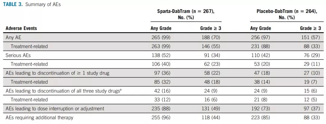 sparta-DabTram组和安慰剂-DabTram 组的中位暴露持续时间为 13.2个月和11.8个月,≥3级的任意AE发生率分别为70%和50%,sparta-DabTram组常见于:CK-MB升高(8%)、发热(5%)和AST升高(4%);而≥3级的TRAE发生率则分别为55%和33%,sparta-DabTram组常见于:发热(66%)、寒战(29%)、腹泻(24%)和恶心(24%)。安慰剂组有2例死于TRAE(胰腺炎和脑血管意外各1例)。
