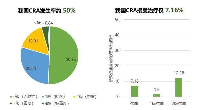 目前流行病学显示我国肿瘤相关性贫血(CRA) 的患病率为30-90%[1] ,患者基数庞大。2019年国内一项涉及97家医院的调查显示,我国肿瘤相关性贫血的的发生率约50%,其中中重度以上贫血发生率达20.40%,也就是说,临床中大约有一半的肿瘤患者存在贫血,有五分之一的肿瘤患者存在中重度以上贫血。尤其像泌尿系肿瘤、胃肠道肿瘤、女性生殖系肿瘤、肺癌的贫血发生率都在50%以上。其中高达92.84%的肿瘤相关性贫血患者未得到任何纠正贫血的治疗[2]。