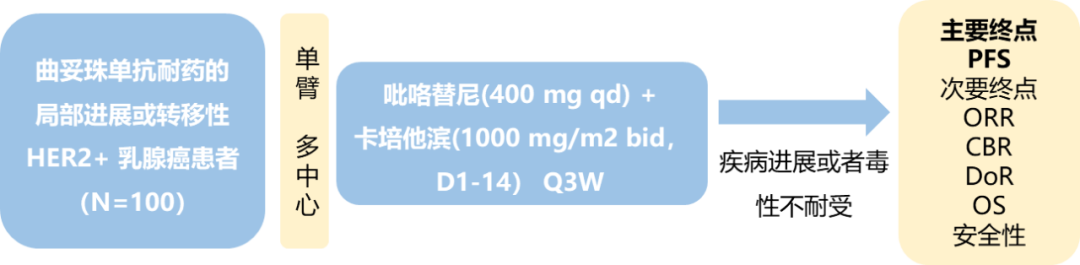 这是一项研究者发起的临床研究,纳入的都是曲妥珠单抗经治且原发耐药的患者,接受吡咯替尼联合卡培他滨的治疗。主要终点是研究者评估的PFS,共有17家中心参与入组。2019年6月首例患者开始研究治疗,目前已经完成100例患者入组。这是目前,专门针对中国曲妥珠耐药患者,样本量最大的一项研究,也非常具有探索价值。相信这项研究的结果可以回答目前临床实践中的很多问题。