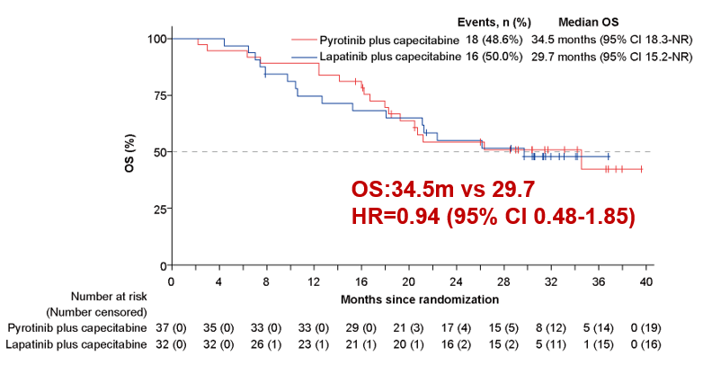 由于本次数据分析截至时OS数据尚不成熟,吡咯替尼组ITT人群的中位OS尚未达到。曲妥耐药亚组人群中发生死亡的事件数较少,目前的样本量和事件数尚不足以看到在曲妥耐药人群中,两个治疗组总生存的显著性差异。但这不代表耐药亚组没有总生存获益,因为前期随访已经观察到两条曲线分开的趋势。如果在样本量足够的前提下,或许这种获益趋势可以转化成有统计学意义的提高。
