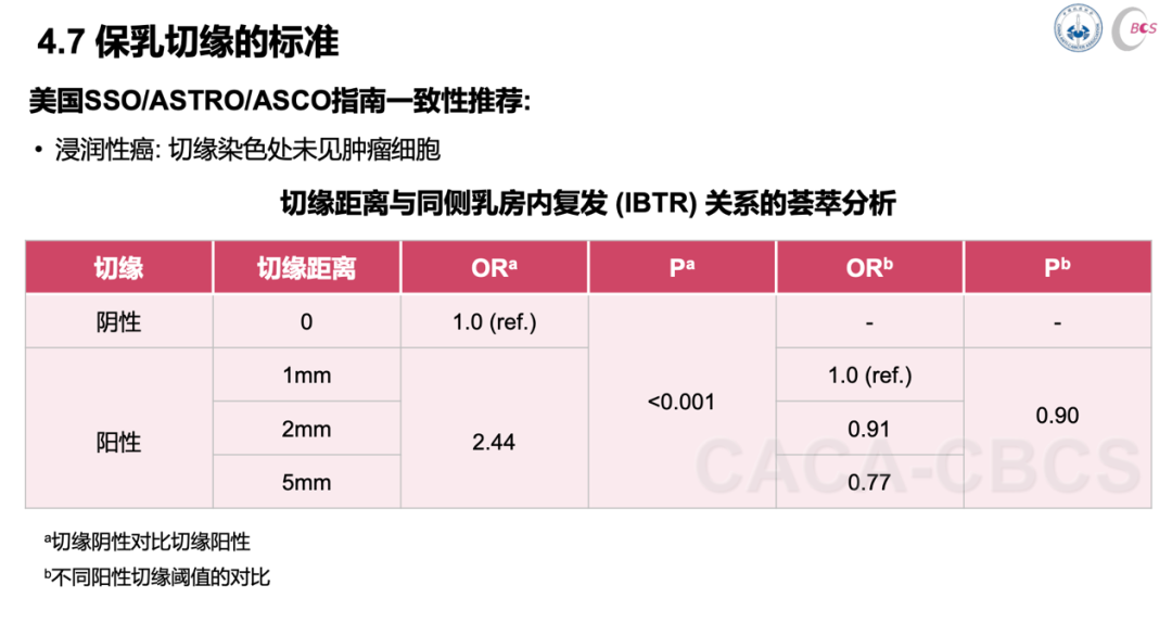 阴性切缘是保障保乳手术安全性的关键。国外指南一致性推荐切缘阴性的标准是“no ink on tumor”,但它的实施必须抛弃术中冰冻病理,依靠术后的石蜡病理才能完成。而我们国内90%以上的乳腺中心还在依靠做术中冰冻病理来评判切缘是否阴性,如果做术中切缘病理,保证足够宽度的切缘保乳才能更安全。因此,此次指南明确列出了不同阳性切缘阈值的对比数据,2mm以上的切缘距离更安全。