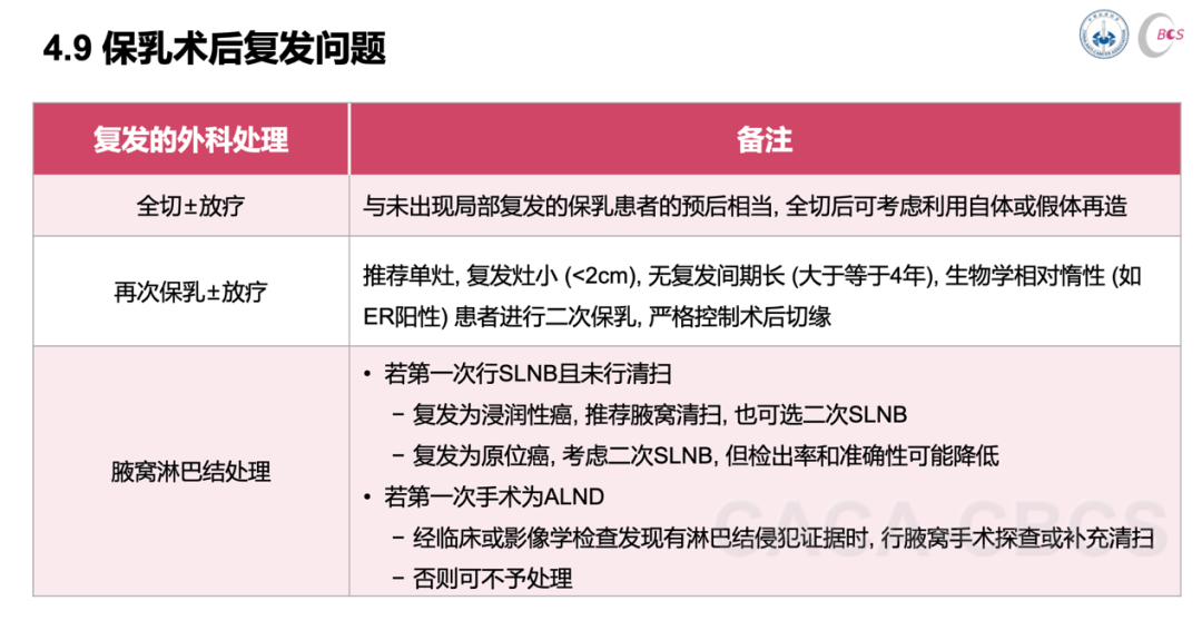 保乳术后复发类型的判定及处理一直都存在争议。此次指南根据复发的位置、时间、发生率、病理特征及与转移的关系等因素详细的阐述了保乳术后真性复发、第二原发癌及弥散复发如何进行鉴别,对于复发时间短的真性复发及弥散复发,要评估全身情况再决定局部处理的方式及时机。如果再次保乳应该选择单病灶小于2cm、无复发间期长(>4年)、生物学相对惰性(ER+)的患者,同时要严格控制术后切缘,切缘的方式更适合垂直切缘放射性取材。关于二次前哨淋巴结活检在指南中虽然提出来,但是只是作为可选,检出率及准确性都会降低。如果要开展二次前哨淋巴结活检,得需要MDT会诊及在有双标法的单位才能实行。