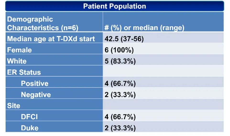 该研究纳入6例HER2+软脑膜转移的晚期乳腺癌患者,软脑膜转移的判断基于影像学和/或阳性细胞学,这些患者在2021年10月18日之前接受了T-DXd治疗,并至少在杜克癌症研究所和Dana Farber癌症研究所接受过1次再分期评估。数据从患者的电子医疗记录中提取,并输入一个安全的、患者身份去隐私化的数据库。客观MRI反应定义为经放射学家评估神经影像学有明确的改善且无临床进展迹象。临床获益定义为影像学评估为疾病稳定或客观缓解且无临床进展的迹象。治疗时长定义为T-Dxd从C1D1到治疗结束或死亡。研究人口学特征见下表。患者的平均年龄是42.5岁。