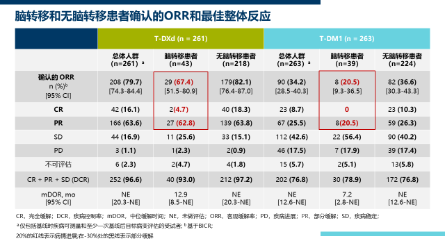 DESTINY-Breast03研究中存在基线脑转移的患者,T-Dxd组的中位PFS为15个月(12.5-22.2),T-DM1组的中位PFS则为3个月(2.8-5.8),ORR分别为67.4% vs 20.5%。