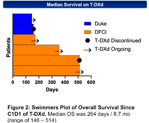 6例患者(100%)都获得了临床获益, 5例(83.3%)患者获得了MRI客观反应。患者的平均治疗周期为6.5(5-23)个周期。T-DXd治疗的中位持续时间为160天(125-514),6个患者中有4个患者(66.7%)接受了持续治疗。从开始接受T-Dxd治疗到死亡或最后一次随访的中位生存期为264天(146-514)。从最初诊断为软脑膜转移到死亡或最后一次随访的中位生存期为379天(208-626)。该研究也为T-Dxd在乳腺癌软脑膜转移患者以及其他HER2+肿瘤类型中进行前瞻性评估提供了理论依据。
