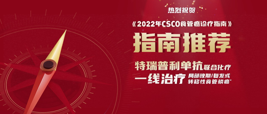 基于JUPITER-06研究的突破性成果,特瑞普利单抗对食管癌一线治疗的OS记录的刷新获得广泛认可,不但在2021年11月获得美国FDA授予治疗食管癌的孤儿药资格认定,也在最新的《中国临床肿瘤学会(CSCO)食管癌诊疗指南2022版》一线治疗领域以特瑞普利单抗联合化疗方案予以II级推荐,IA类证据。该指南已于4月22日正式发布,是最注重中国食管癌特点、最适合国人的食管癌诊疗规范。