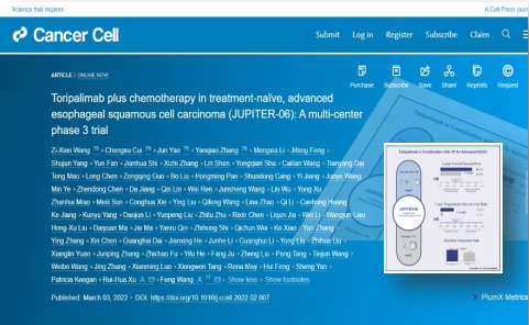 我国是食管癌大国,年新发患者约占全球一半。由于食管癌具有明显的地域分布差异,我国食管癌的发病特点与西方国家明显不同。随着近年免疫治疗的发展,食管癌领域的二线、一线治疗先后迎来突破,尤其是2021年公布的我国主导的JUPITER-06研究,刷新了食管癌一线治疗生存期的记录,获得广泛认可,并纳入《中国临床肿瘤学会(CSCO)食管癌诊疗指南2022》指南一线方案(II级推荐,IA类证据)。肿瘤瞭望特别整理JUPITER-06研究带来的食管癌免疫治疗一线突破,与读者一起看中国研究补益中国指南。