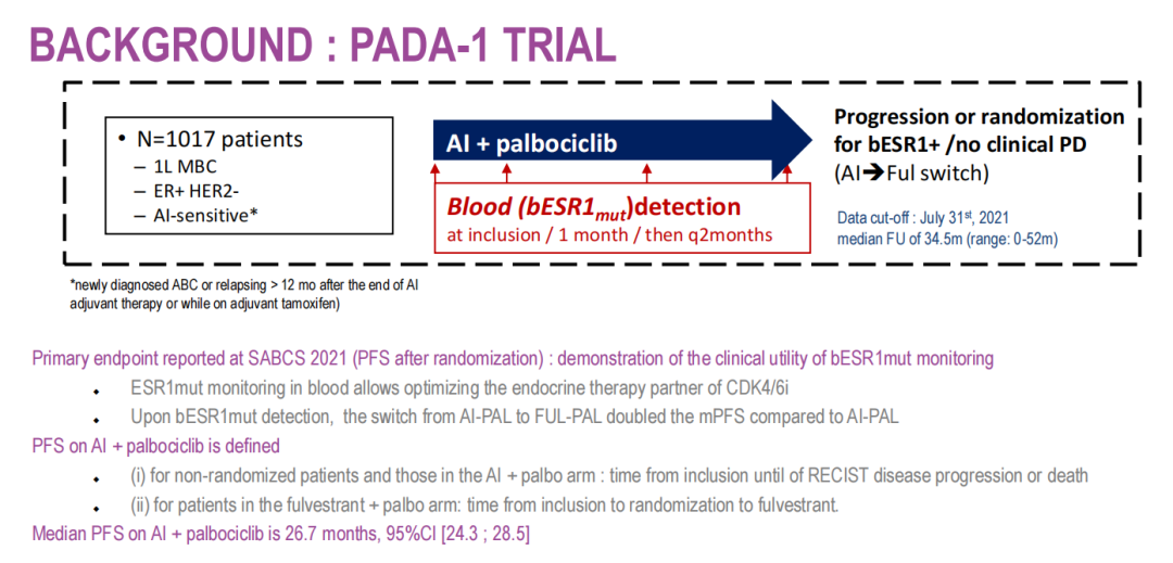 PADA-1这项Ⅲ期临床试验初衷即是通过定期监测ctDNA的ESR1突变水平来证明其临床有效性以及指导对于存在ESR1基因突变的患者将治疗方案从PAL+AI更换为PAL+Ful方案的有效性及安全性。该试验获得了阳性结果,首次证实了动态监测ESR1突变的临床价值以及对于ESR1基因突变的患者在发生疾病进展前更换方案为PAL+Ful可获得更高的PFS,该项试验的结果也在去年的圣安东尼奥会议上进行了报道。
