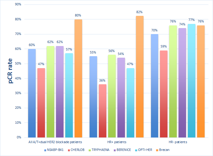 OPTI-HER研究(THP+nPLD×6)将阿霉素替换为非聚乙二醇化脂质体阿霉素(nPLD),结果显示可获得56.6%的pCR率,其中HR+和HR-的pCR率分别为47%和77%;仅发生1例3级LVSD而没有4级LVSD。本团队开展的这项Brecan研究(PldC+HP×4→Nab-P+HP×4),将双靶抗HER2治疗延长至8个周期,并采用聚乙二醇化脂质体阿霉素(PLD)和白蛋白紫杉醇(Nab-P)代替阿霉素和紫杉醇,结果显示pCR率达到了80.2%,且HR+和HR-的pCR率分别达到82%和76%,但HER2表达水平对pCR率有影响,与OPTI-HER研究相似(HER2固有亚型的pCR率可达83%);安全性方面,没有发生>2级的LVSD,血液毒性和周围神经病变也可以耐受。