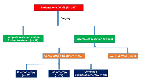 研究方法:在中国的一个单中心进行了一项大型回顾性队列研究,纳入并分析了166例2008年4月~2021年8月期间的新诊断原发局限性OAML患者,收集所有患者在诊断和治疗时的详细的疾病特征数据,并在治疗结束后1个月和随后的每6个月进行一次疗效的评估,然后比较了具有不同特征和治疗方法的OAML患者的疗效和无进展生存期(PFS)。