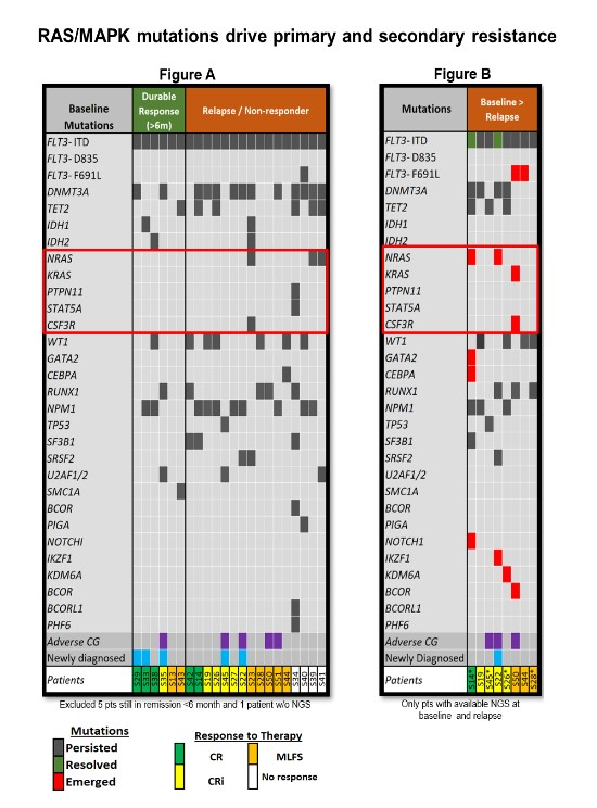 ③RAS/MAPK突变似乎会同时驱动原发性和继发性耐药性。有潜在RAS/MAPK突变的患者治疗应答率最低,为40%,而没有RAS/MAPK突变的患者为94%。6例获得持续缓解(>6个月)的患者中,在基线时均未出现RAS/MAPK突变(图A)。16例复发(缓解小于6个月)或对该三联方案难治的患者中有4例(25%)存在基线RAS/MAPK突变。8例患者对治疗有应答但随后复发(图B),分析其治疗前和治疗后的NGS数据发现,37%的复发患者中出现紧急RAS/MAPK突变(3/8),而25%的复发患者中出现紧急FLT3 F691L看门人基因突变(2/8)。有趣的是,我们并没有出现紧急的FLT3-TKD突变。