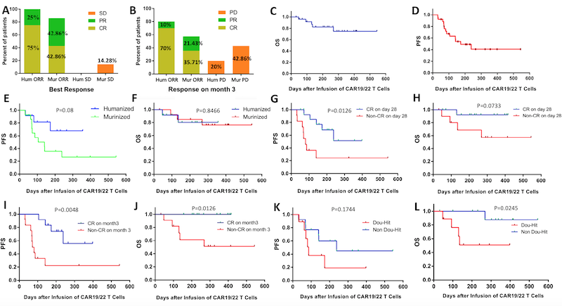 At the day 28 assessment, 12/12 (100%) patients received the humanized CAR-T cells achieved overall response, including 9/12 (75%) CR and 3/12 (25%) partial remission (PR), while the overall response rate (ORR) and CR rate of the murinized group was 85.71% (12/14) and 42.86% (6/14) respectively. Among of them, all 4 Burkitt lymphoma patients in both groups achieved CR. In 3 months evaluation, 7/10 (70%,2 cases received infusion for less than 3 months) patients in the humanized group maintained in CR, which was higher than the murinized group with CR rate of 5/14 (35.71%). (Figure 1A-B). At a median follow-up of 291 days (range, 31 to 544), patients in the humanized group had a favorable progression-free survival (PFS) than those in the murinized (1-year PFS of 67.9% vs. 26.8%), although there was no statistical significance (p=0.08) due to the limited number of patients enrolled (Figure 1E-F). Achieving CR on day 28 (HR: 0.21, 95% CI: 0.06-0.72; P=0.012) and maintaining CR till the 3rd month (HR: 0.18, 95% CI: 0.06-0.59; P=0.004) were found as independent prognostic factors associated with favorable PFS. Maintaining CR till the 3rd month (HR: 0.10, 95% CI: 0.01-0.61; P=0.012) and non-double hit (HR: 0.11, 95% CI: 0.02-0.76, P=0.024) predicted a longer overall survival (OS) (Figure 1G-L). Despite impressive CR rates wereachieved, majority of patients had mild CRS (grade 1-2) in both group. Only 2patients experienced grade 3 CRS, and 2 patients developed grade 3 neurotoxicity.