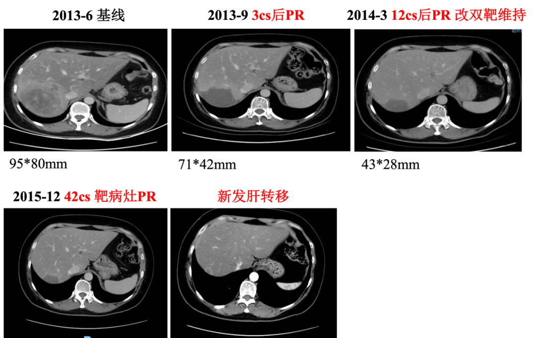 入组MO28047临床试验(PERUSE研究),于2013-7-16开始行紫杉醇+曲妥珠单抗+帕妥珠单抗方案治疗,具体:紫杉醇175mg/m2 270mg d1;帕妥珠单抗首剂840mg,以后420mg d1;曲妥珠单抗首剂 8mg/kg 484mg,以后6mg/kg 363mg d1,Q21d。最佳疗效PR,自第10周期调整为双靶维持治疗。2015年12月(42周期时)原靶病灶维持PR,新发18mm肝转移,评效病情进展,PFS为30月。不良反应:腹泻2级,粒细胞下降2级。