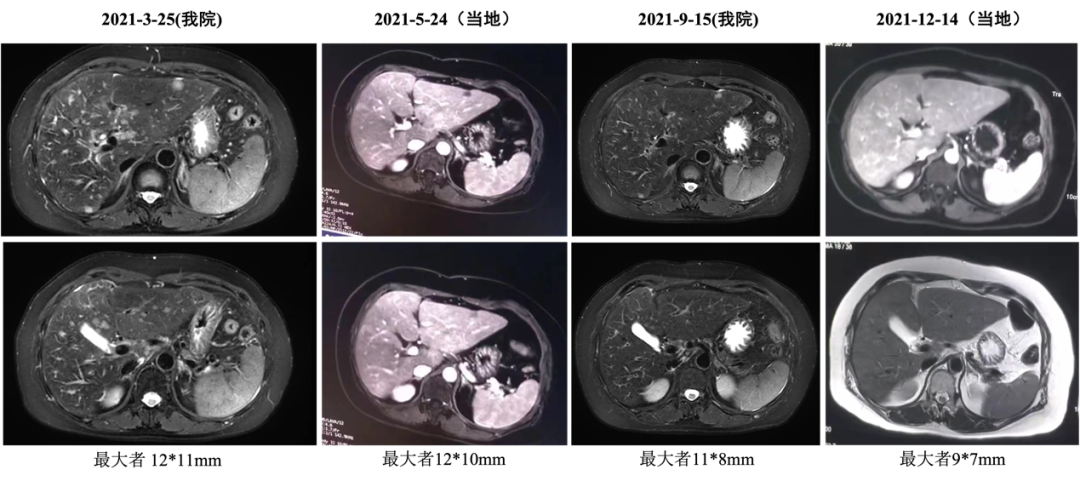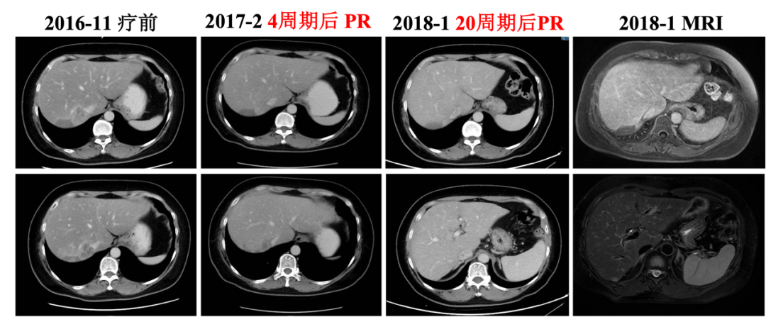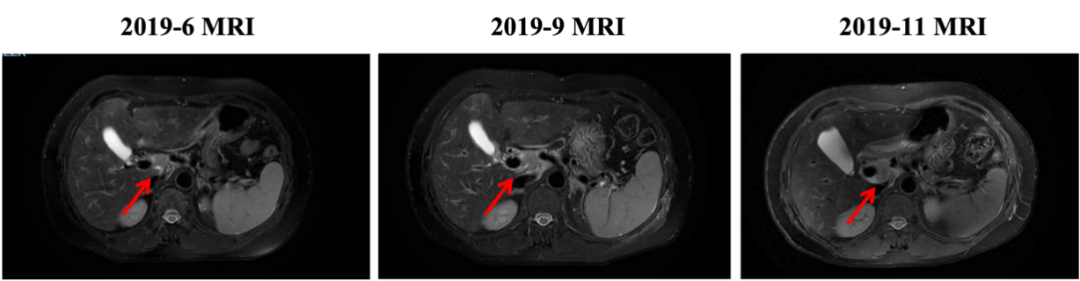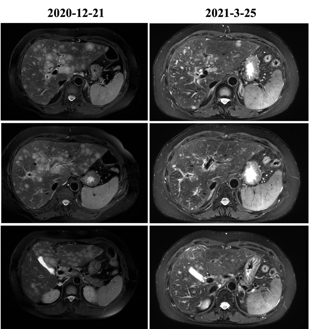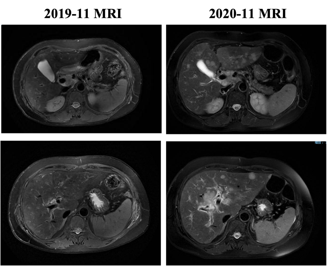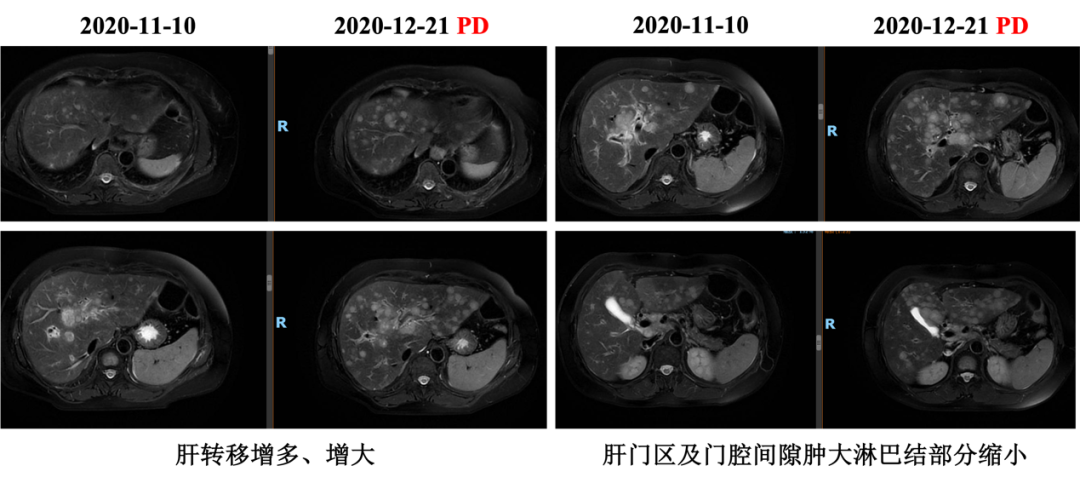 自2020-11-10行白蛋白紫杉醇+伊尼妥单抗治疗2周期,具体:伊尼妥单抗8mg/kg 首剂,6mg/kg 后续d1+白蛋白紫杉醇125mg/m2 200mg d1、d8,Q21d。2周期后肝转移增多、增大,肝门区及门腔间隙肿大淋巴结部分缩小,综合评效PD,PFS为1.5月。