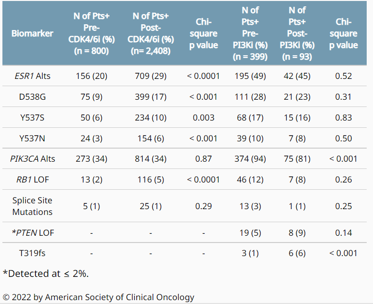 结果:表中显示了在CDK4/6i或PI3Ki治疗前后,患者样本检测到的某些基因突变频率的差异。在CDK4/6i治疗之前具有RB1功能缺失改变的患者TTD比对照组更差,并且TTNT数值上也更差(TTD = 3 mos vs 4.7 mos,P=0.018;TTNT = 7.3 mos vs 8 mos,P=0.082)。在PI3Ki治疗之前具有PTEN功能缺失的患者TTD或TTNT与对照组相比则没有显着差异(TTD = 4.1 mos vs 4.1 mos,P=0.92;TTNT = 7.4 mos vs 7 mos,P=0.32)。值得注意的是,有54%接受CDK4/6i治疗的患者以及84%接受PI3Ki治疗的患者正在接受第三线或三线以后的治疗。