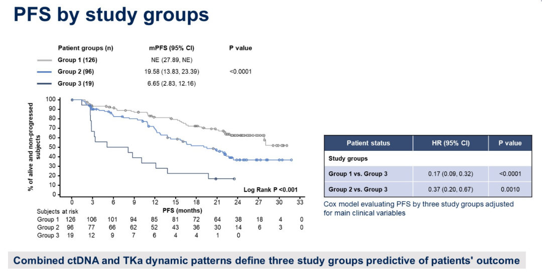方法:纳入研究的患者为287人。总体而言,两种生物标志物的早期动态评估有241位患者,占到总人数的84%。使用ctDNA和TKa来评估的方法早期已有文章报道。对于ctDNA来说,如果在D0和D15未观察到突变,则将病例定义为野生型(WT);如果在D15观察到或者未观察到主要靶突变,则将病例定义为ctDNA阳性(ctDNA+)或者ctDNA阴性(ctDNA-)。同样,如果在D15的TKa水平高于或低于其检测阈值,则样品为TKa+或TKa-。根据ctDNA和TKa,患者可分为:WT/TKa-、WT/TKa+、ctDNA-/TKa-、ctDNA-/TKa+、ctDNA+/TKa-和ctDNA+/TKa+,然后将患者分为3个主要研究组WT/TKa-(GR1,n=126)、WT/TKa+、ctDNA-/TKa-、ctDNA-/TKa+、ctDNA+/TKa-(GR2,n=96)和ctDNA+/TKa+(GR3,n=19)。使用Kaplan-Meier分析和多变量Cox模型估计生物标志物和无进展生存期(PFS)之间的关联,其中95%置信区间(CIs)已针对临床变量进行了调整。