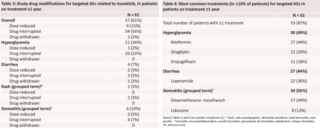 中位治疗时间为19个月(12-45个月);Inavolisib中位累积剂量强度为95%。最常见的治疗相关不良事件(AEs≥20例/35%)为高血糖(68%)、口腔炎(68%)、中性粒细胞减少(58%)、腹泻(51%)、恶心(39%)、脱发(35%)和皮疹(35%)。最常见的治疗相关分级达到3-4级AEs(AEs≥2例/4%)为中性粒细胞减少(47%)、高血糖(16%)、白细胞减少(9%)、血小板减少(9%)、淋巴细胞减少(7%)、体重下降(4%)和低钾血症(4%)。