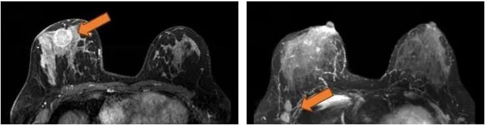 2021.7.7乳腺MRI:右乳外上象限肿物(BI-RADS-6)3.1cm×1.9cm×3.0cm,右腋窝见肿大淋巴结,M灶可能。