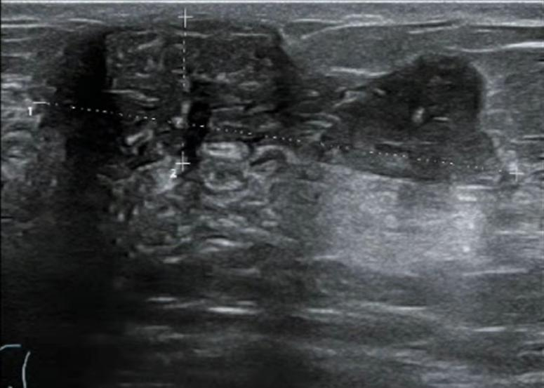 右乳10点方向腺体层探及一实质低回声肿块,大小约35.1×22.6mm,内部回声不均匀,其内可探及多个点状强回声,边界不清,形态不规则,周边可见毛刺征,CDFI、CDE示其内血供丰富。右侧腋窝探及多个实质低回声结节,大者约10.2×5.2mm,皮质稍增宽,CDFI、CDE示其内血供不丰富。