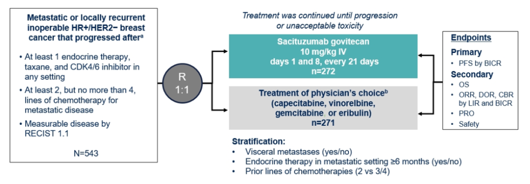 Hope S. Rugo教授:TROPiCS-02研究是一项Ⅲ期临床试验,入组患者为转移性或局部复发不可切除的HR+/HER2-晚期乳腺癌;治疗方案为随机接受SG药物治疗(第1天和第8天用药,每21天为1个周期)或者医生选择的化疗(TPC)。入组的患者至少要进行过一线内分泌治疗,紫杉烷和CDK4/6抑制剂治疗。符合条件的患者接受了至少二线但不超过四线的化疗。