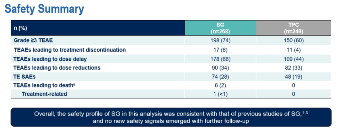 这一结果非常令人兴奋,因为统计分层设计让我们看到了总生存率和生活质量方面的差异。结果显示,接受SG治疗的患者有更好的获益,临床获益率和反应持续时间也长。与接受TPC治疗的患者相比,接受SG治疗的患者报告结局中全球健康状况的生活质量和至疾病恶化时间明显更长。