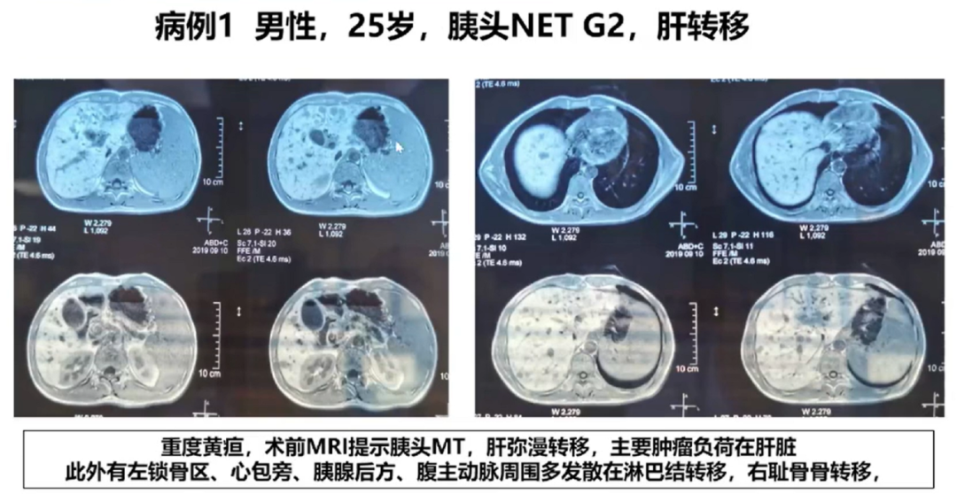 病例1,为胰头NET G2,弥漫性肝转移,黄疸严重,无法通过引流或改道手术缓解。患者接受了肝胰十二指肠联合移植,术后给予抗排异和SSA治疗,目前已经生存近3年,肝外转移疾病稳定。