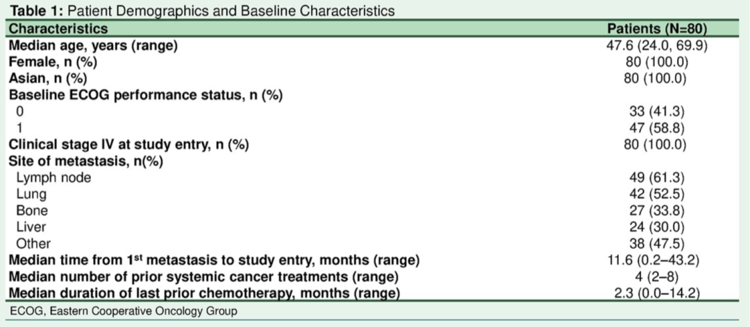 截至2021年8月6日首次分析,80例符合条件的患者接受了≥1次的SG治疗,中位年龄47.6岁(24.0-69.9),既往接受中位4线(2-8)治疗。所入组患者均为Ⅳ期乳腺癌患者,存在淋巴结、肺、骨、肝等部位转移。