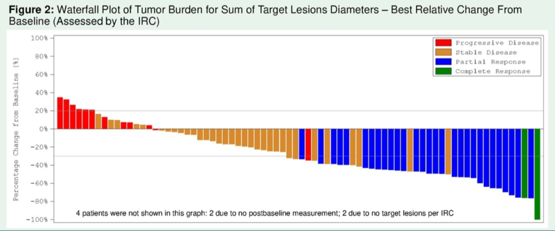 研究结果显示,IRC评估的ORR为38.8%(95%CI: 28.06-50.30),CBR为43.8%(95%CI: 32.68-55.30%),其中2例(2.5%)CR,29例(36.3%)PR。76.3%的患者出现肿瘤缩小,50%的患者靶病灶缩小≥30%。