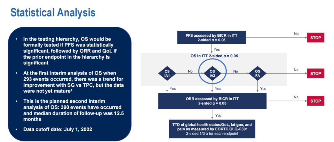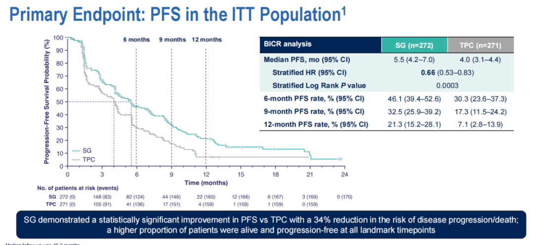 截止到2022年7月1日(中位随访12.5个月),有390例OS事件发生。SG组与TPC组相比,OS、ORR、生质量以及疲劳感均有显著改善。SG的安全性与既往研究一致,未发现新的安全性问题。