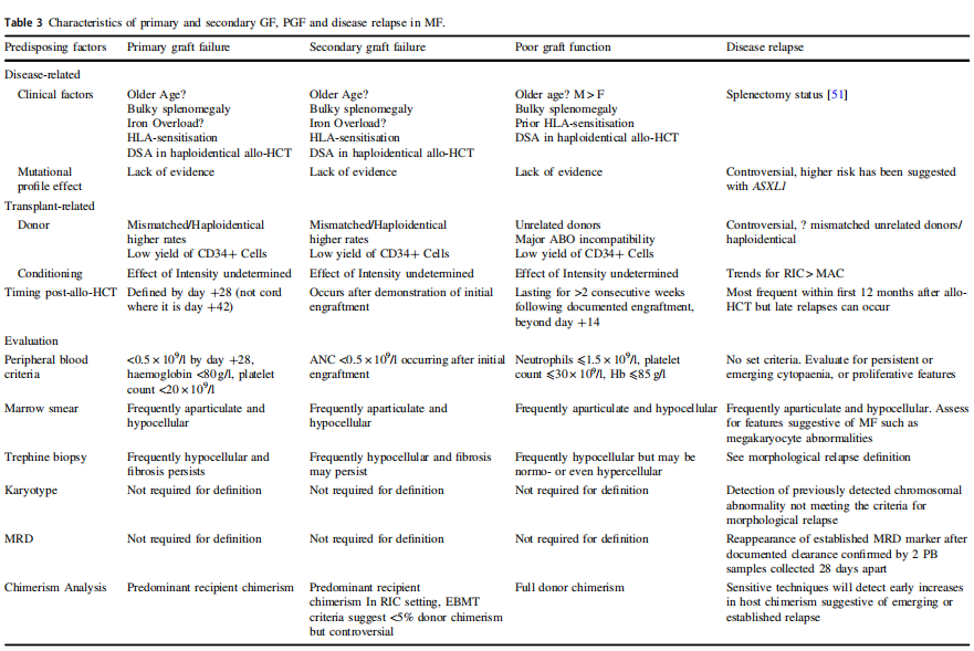 ?植入功能不良:目前并没有被普遍接受的植入功能不良(PGF)定义,目前EBMT将PGF定义为:在供体嵌合&gt;5%的情况下,移植28天后出现两系或三系的血细胞减少且持续时间超过2周,但这一定义很难应用于临床实践中。Stasia和Klyuchnikov等人提出了一种新的PGF定义,即在且完全供体嵌合的情况下,至少两种造血干细胞系中存在轻或中度血细胞减少(ANC?1.5×109/L;血小板计数?30×109/L,Hb?85g/L),并且持续2周以上。该定义要求无严重急性或慢性移植物抗宿主病(GVHD)、复发和药物或巨细胞病毒(CMV)再激活相关的骨髓抑制,危险因素包括宿主年龄、疾病相关特征(例如高危MF)、使用无血缘关系的供体、低CD34+细胞剂量等,由Hamburg工作组开展的一项研究,纳入了100例接受降低强度预处理(RIC)+Allo-HSCT治疗的MF患者,旨在探索PGF的发生率和危险因素,结果显示:PGF的累积发生率为17%,中位发病时间为49天;危险因素则包括年龄较大(尤其是男性)以及30天后出现持续的脾脏肿大。