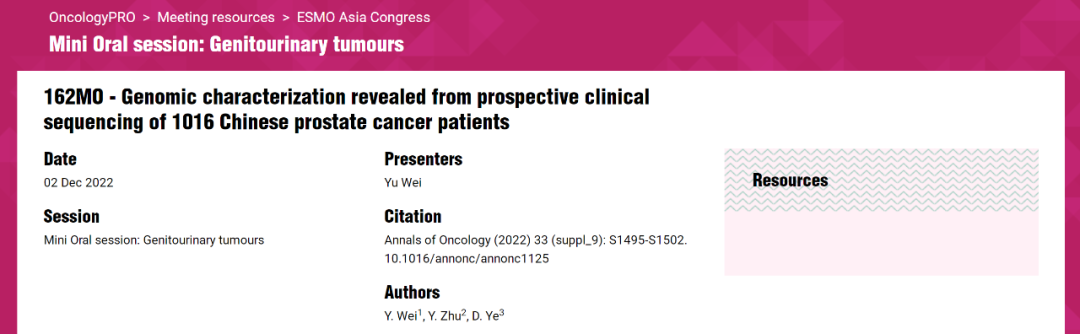 3.Abstract 162MO‘Genomic Characterization Revealed from Prospective Clinical Sequencing of 1016 Chinese Prostate Cancer Patients’will be presented by Yu Wei during the Genitourinary Tumours Mini Oral Session on Friday 2 December,16:15-17:45 SGT in Hall 407.Annals of Oncology,Volume 33,Supplement 9,November 2022.