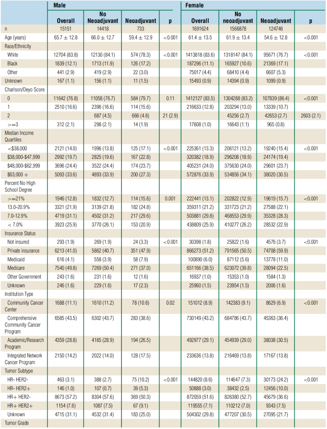 研究人员对2004年至2017年美国国家癌症数据库(NCDB)的数据进行了回顾性分析。研究人员首先确定了所有诊断为非转移性侵袭性乳腺癌患者(AJCC临床期Ⅰ-Ⅲ期),并根据性别、临床肿瘤分期(非局部晚期cT1/2;局部晚期cT3/4),以及患者是否接受了NT进行了分层。