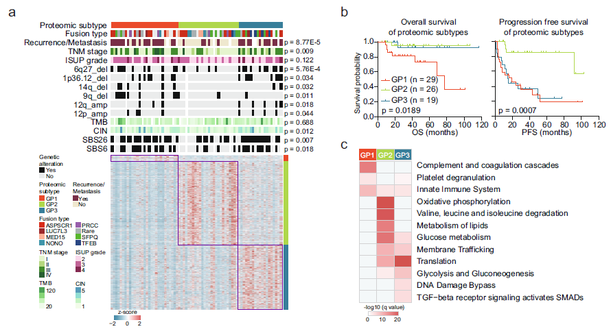 本研究共鉴定了15种TFE3融合伴侣,包括ASPSCR1、SFPQ、NONO、PRCC、MED15、LUC7L3、PTPN12、ZNF627、EWSR1、PARP14、KHSRP、MATR3、RBM10、U2AF2和VCP等基因发生融合;鉴定了4种TFEB融合伴侣,包括CLTC、ACTB、NEAT1和EIF4A2,其中PTPN12-TFE3、ZNF627-TFE3、U2AF2-TFE3和EIF4A2-TFEB融合类型为本研究首次报道。(图1B)。与透明细胞肾癌基因突变谱不同的是,tRCC队列中突变频率相对较高基因是BCDIN3D、NDRG1和ZNF668(图1C)。根据蛋白组表达谱将患者分为三种蛋白亚型(GP1-3),其中GP1免疫浸润型主要富集补体和凝血级联固有免疫通路,该组患者OS和PFS均最差,提示需要更加积极的临床治疗,临床可选择免疫治疗;GP2代谢维持型,主要富集氧化磷酸化、氨基酸、脂肪酸和糖代谢通路,该组患者OS和PFS均最好,临床可以选择TKI靶向治疗;GP3过渡型,主要富集翻译和DNA损伤等通路,该组患者容易出现疾病进展,但OS相对较长,临床可考虑TKI+mTOR联合治疗(图1D)。