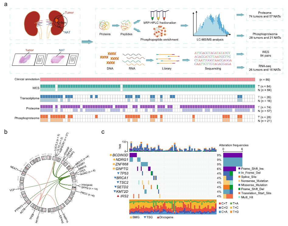 为了解决上述瓶颈问题,复旦大学肿瘤医院泌尿外科叶定伟教授团队和复旦大学表型研究院丁琛教授团队、上海交通大学医学院附属新华医院赵健元教授团队联合对86例中国人群MiT家族易位肾细胞癌进行蛋白质基因组学测序分析,并结合患者临床病理特征和生存数据进行分析(图1A)。相关研究成果以“MiT家族易位肾细胞癌的蛋白质基因组学表征(Proteogenomic characterization of MiT family translocation renal cell carcinoma)”为题,于北京时间2022年12月5日在线发表于最新一期《自然·通讯》(Nature Communications)杂志上。