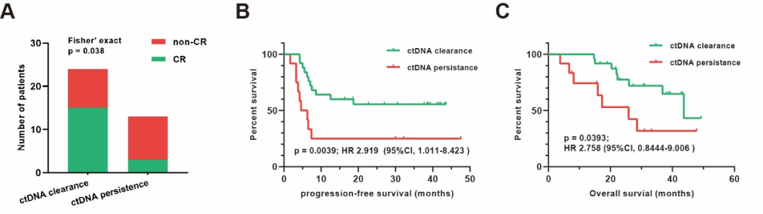 ③更为重要的是,相比治疗2个周期后外周血ctDNA持续存在的患者,ctDNA达到完全清除的患者表现出更长的无进展生存期(中位PFS未达到vs.5.45个月;HR 2.919;P=0039,图B)和总体生存期(中位OS 43.6 vs.25.87个月;HR 2.758;P=0.0393,图C)。这些结果说明在治疗早期获得ctDNA清除的患者可能获得更好的临床获益。