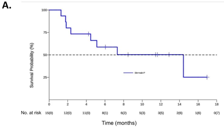 中位随访时间为12.1个月,8例患者病情进展,5例死亡。中位PFS为14.4个月(95%CI,4.0~24.7)。中位OS未达到。见图3。
