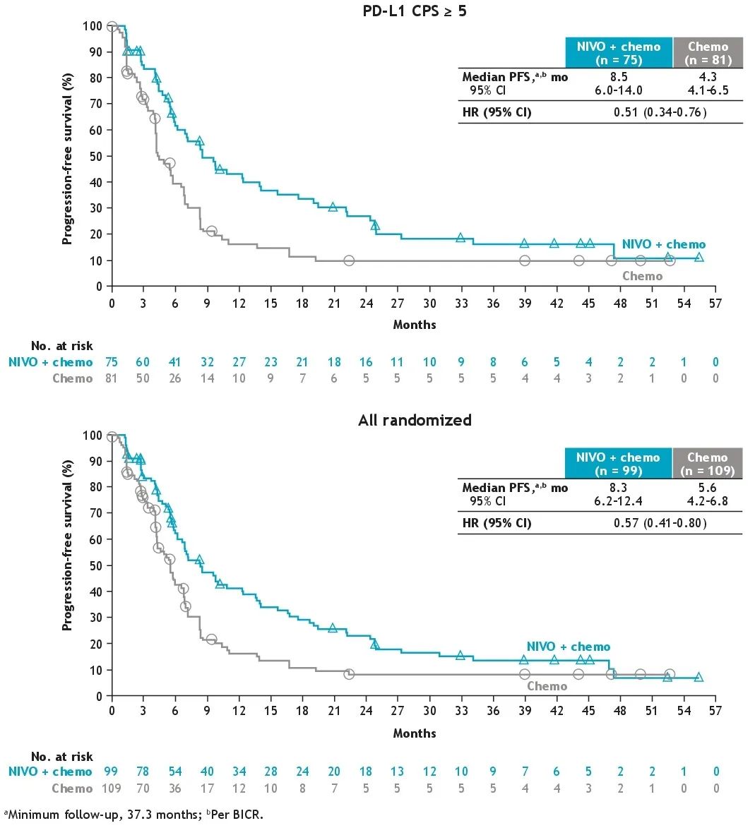 随着更长时间的随访,中国患者中,NIVO+化疗与单独化疗相比,PFS持续获益(图4):在PD-L1 CPS≥5患者中,进展或死亡风险降低49%(中位PFS:8.5个月vs.4.3个月;HR=0.51),在所有随机入组患者中,进展或死亡风险降低43%(中位PFS:8.3个月vs.5.6个月;HR=0.57)。