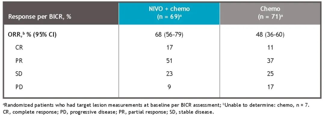 在PD-L1 CPS≥5且基线有可测量病变的患者中,NIVO+化疗vs.化疗的客观缓解率(ORR)为68%vs.48%;在所有随机入组患者中,ORR分别为66%和45%(表1,表2)。
