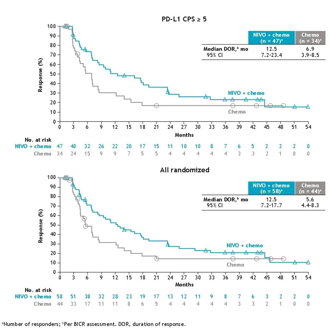 无论是在PD-L1 CPS≥5的患者中还是在所有随机入组的患者中,随着更长时间的随访,与化疗相比,接受NIVO+化疗的患者保持更高的ORR,缓解持续时间更长(表1,表2,图5)。